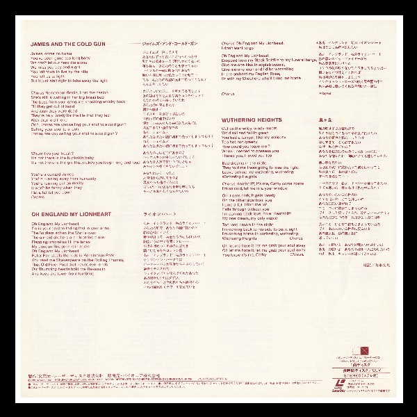Reissue der japanischen Laserdisc mit OBI. Card Picture Sleeve. Zweiseitiges Textbeiblatt mit Infos und Songtexten auf englisch und japanisch.